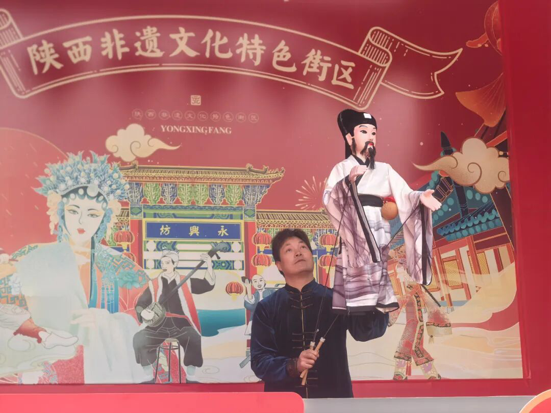 西安永興坊內(nèi),木偶“李白”與游客互動 秦毅 攝