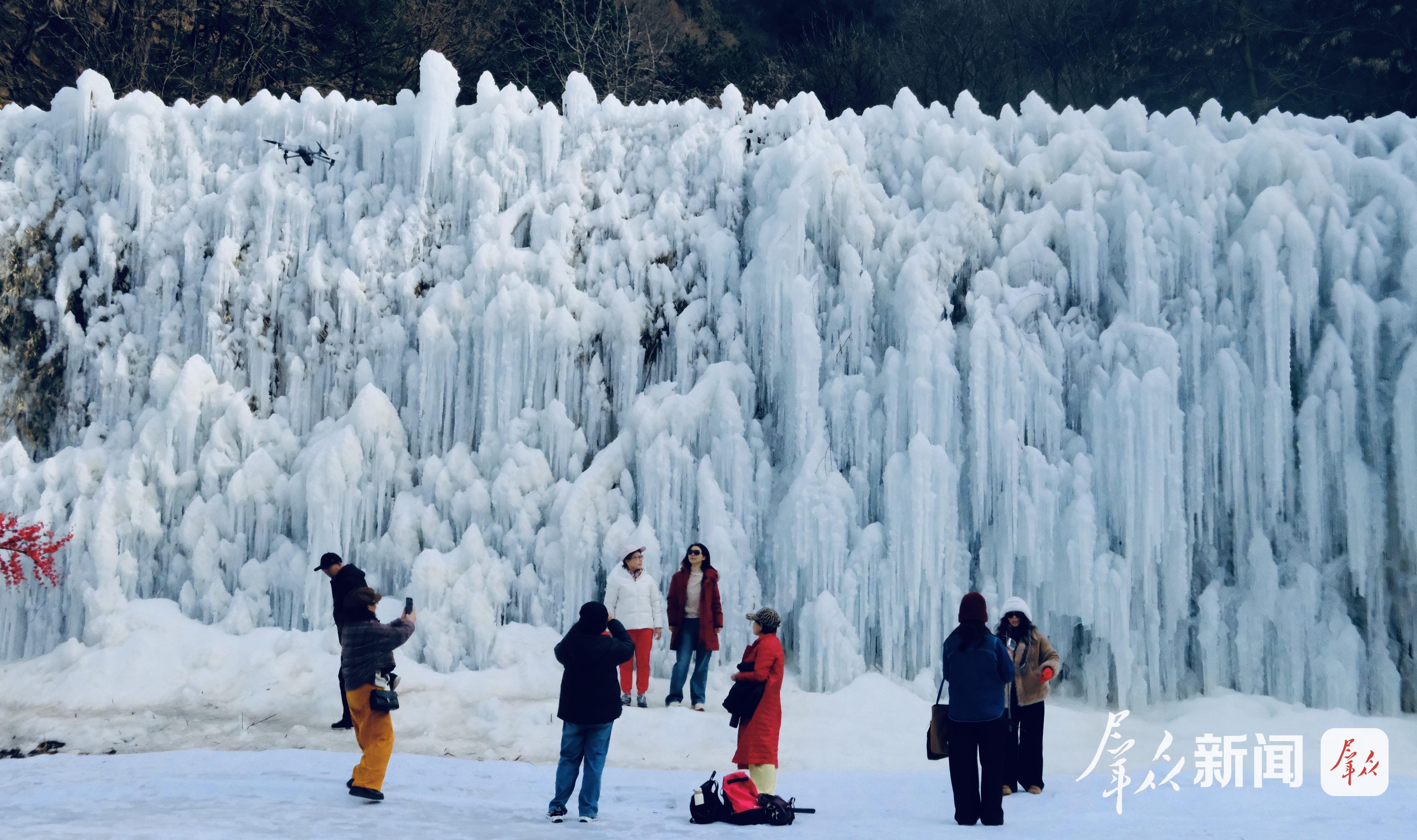 這里不僅是冰雪的王國,更有靈動的麋鹿身影點綴林間,平添幾分童話般的生機。游客們呼朋引伴,踏雪而行,赴一場與寒冬的浪漫約會。游客易女士感慨:“城里難見積雪,在這兒卻遇上如此磅礴的冰瀑,恍然間仿佛置身東北?!彼又f,“人們總困于手機屏幕之間,來到這里,眼睛望的是遼闊的自然,身心也跟著舒展開來?!?/p>