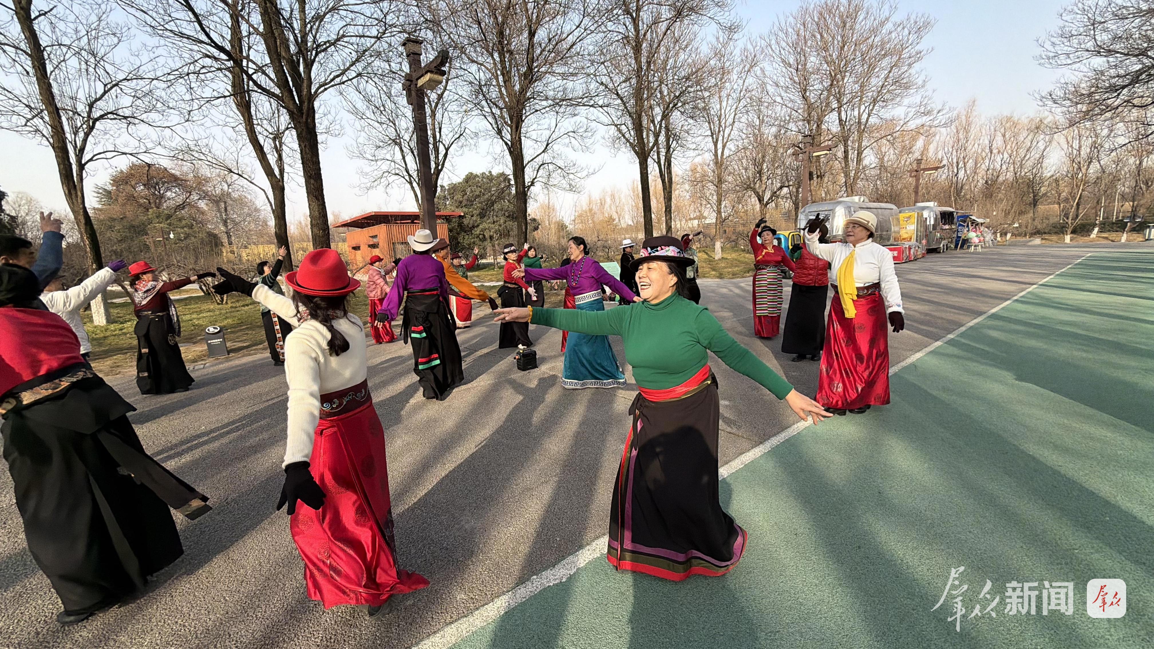 與此同時(shí),大明宮國家遺址公園內(nèi)也是一片熱鬧景象。公園步道上,身著色彩鮮艷服裝的老年朋友們圍成圓圈,隨著歡快的音樂跳起了鍋莊舞。大家手拉手、肩并肩,踏著整齊的步伐,臉上洋溢著幸福的笑容?!疤伹f舞既能鍛煉身體,又能感受民族文化,越跳越開心!”今年53歲的金紅梅說,她每天都會(huì)和“老姐妹們”來公園跳鍋莊舞,不僅鍛煉了身體,還豐富了晚年生活。