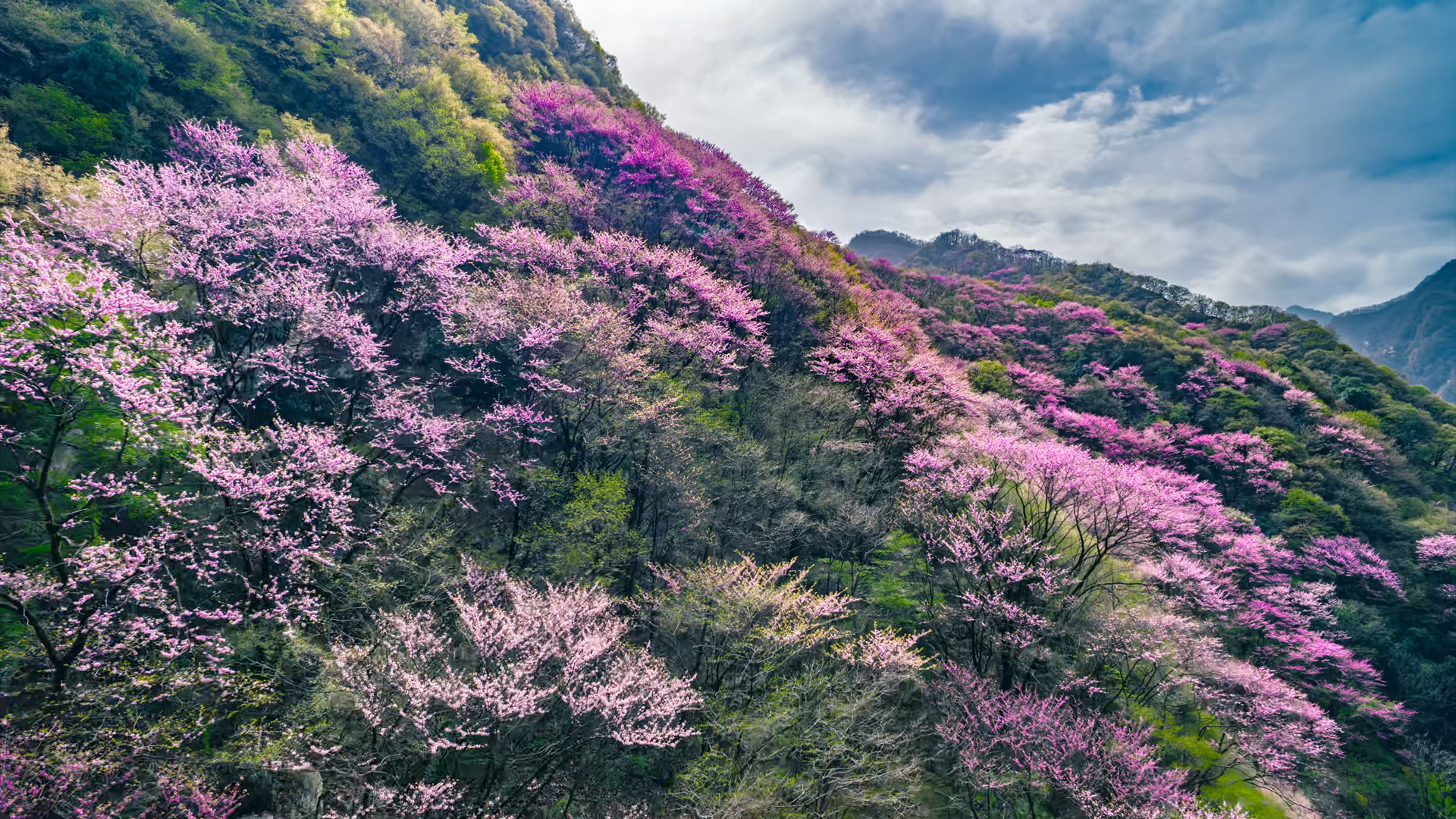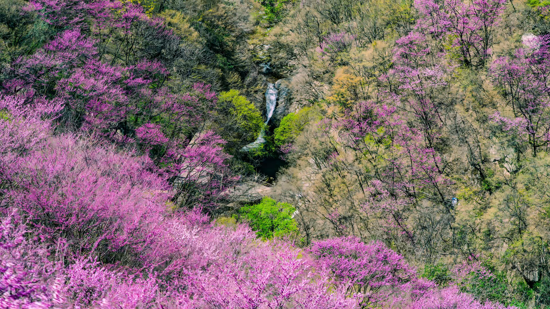 素有“天然植物基因庫”美譽的太平國家森林公園,坐擁秦嶺最大規(guī)模野生紫荊種群。每至四月,漫山遍野的紫荊花沿著山坡蜿蜒分布,形成一條壯觀的“粉色絲帶”,美不勝收。行走于景區(qū)步道,游客既可沉浸式感受萬畝花海的視覺震撼,亦可拾級而上,于山頂俯瞰全景花海,盡享秦嶺的雄渾壯闊與婉約秀美。